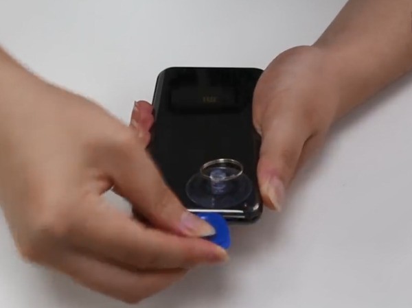 2、用吸盤吸住手機的后蓋,將翹片插入拉開的縫隙中,加占古使后蓋和手機脫離。