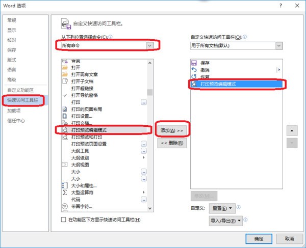 選擇【快速訪問工具欄】,在【從下列位置選擇命令】下面把【常用命令】選擇為【所有命令】;
