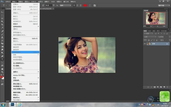 2、打開“編輯--自由變換”,該選項是灰色的,表示不能使用旋轉工具,原因是圖層處在鎖定狀態;