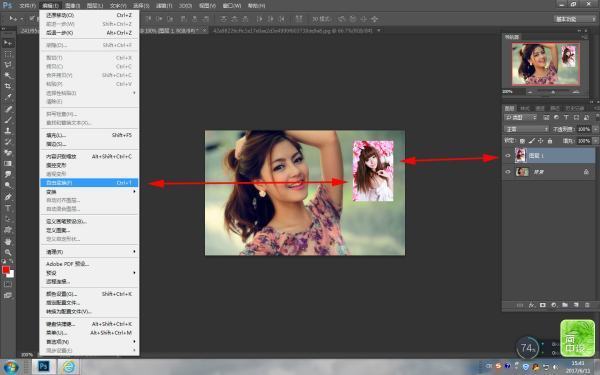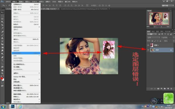 5、“文件--打開”,打開另外一張圖片,拖進背景文件里,要對該圖層進行任意旋轉操作,發現自由變換工迅民社困意免牛具也是灰色的,表示不能使用,檢查發現選定的圖層錯誤,要對某圖層進行任意旋轉操作,必須選定該圖層并且該圖層是活動圖層。