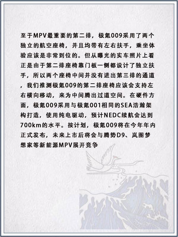 至于MPV最重要的第二排,極氪009采用了兩個獨立的航空座椅,并且均帶有左右扶手,乘坐體驗應該是非常到位的。但從曝光的實車照片上看,正是由于第二排座椅靠門板一側都設計了獨立扶手,所以兩個座椅中間并沒有進出第三排的通道,我們推測極氪009的第二排座椅應該會支持左右橫向移動,來為中間騰出過道空間。在硬件方面,極氪009采用與極氪001相同的SEA浩瀚架構打造,使用純電驅動,預計NEDC續航會達到700km的水平。按計劃,極氪009將在今年年內正式發布,未來上市后將會與騰勢D9、嵐圖夢想家等新能源MPV展開競爭。