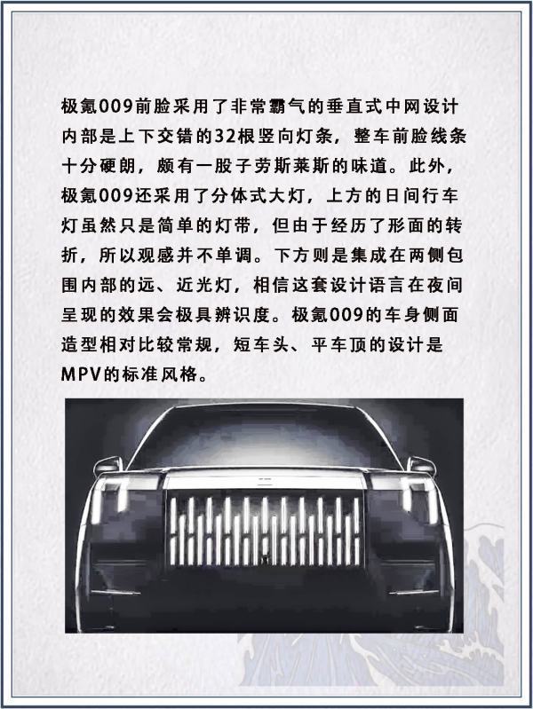 極氪009前臉采用了非常霸氣的垂直式中網設計,內部是上下交錯的32根豎向燈條,整車前臉線條十分硬朗,頗有一股子勞斯萊斯的味道。此外,極氪009還采用了分體式大燈,上方的日間行車燈雖然只是簡單的燈帶,但由于經歷了形面的轉折,所以觀感并不單調。下方則是集成在兩側包圍內部的遠、近光燈,相信這套設計語言在夜間呈現的效果會極具辨識度。極氪009的車身側面造型相對比較常規,短車頭、平車頂的設計是MPV的標準風格。