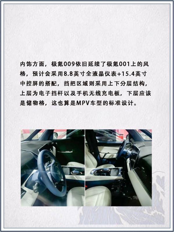 內飾方面,極氪009依舊延續了極氪001上的風格,預計會采用8.8英寸全液晶儀表+15.4英寸中控屏的搭配,擋把區域則采用上下分層結構,上層為電子擋桿以及手機無線充電板,下層應該是儲物格,這也算是MPV車型的標準設計。