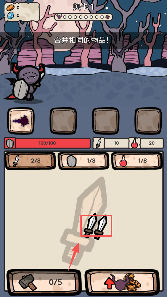2、當物品欄滿時,合并相同物品以升級,獲取更高級裝備。